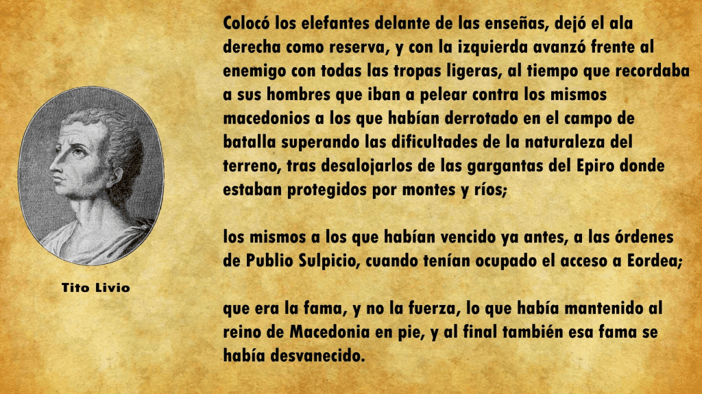 Tito Quincio Flaminio, el cónsul al mando del ejército romano, vio perfectamente cuál sería el resultado antes de la batalla y así se lo hizo ver a sus tropas en la arenga previa al enfrentamiento: