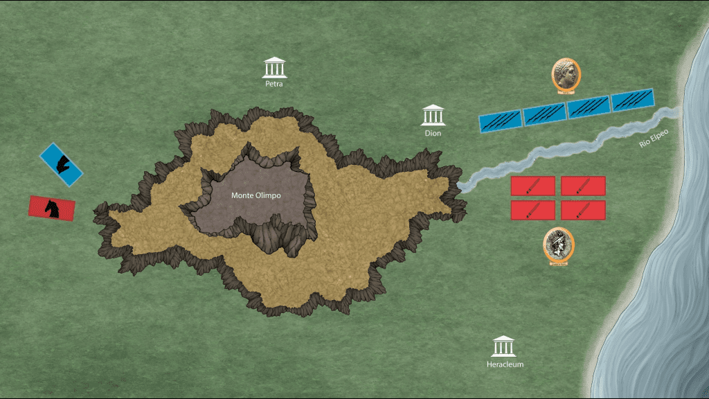 Desde allí, Paulo marchó en dirección a Dion, la capital religiosa de Macedonia. La ciudad se encontraba cerca del monte Olimpo, el cual dejaba un pasillo estrecho entre el mar y la gran montaña. Allí les estaría esperando Perseo.
